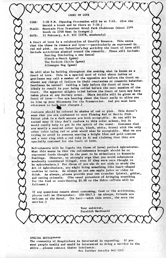 Quill, Vol II Issue 1, Jan 1978, Page 4 Published July 3, 2016 at 549 × 850 in The Questing Quill Volume II Issue 1 The Questing Quill, Vol II Issue 1, January 1978, Page 4Court of Love Announcement Continue reading →